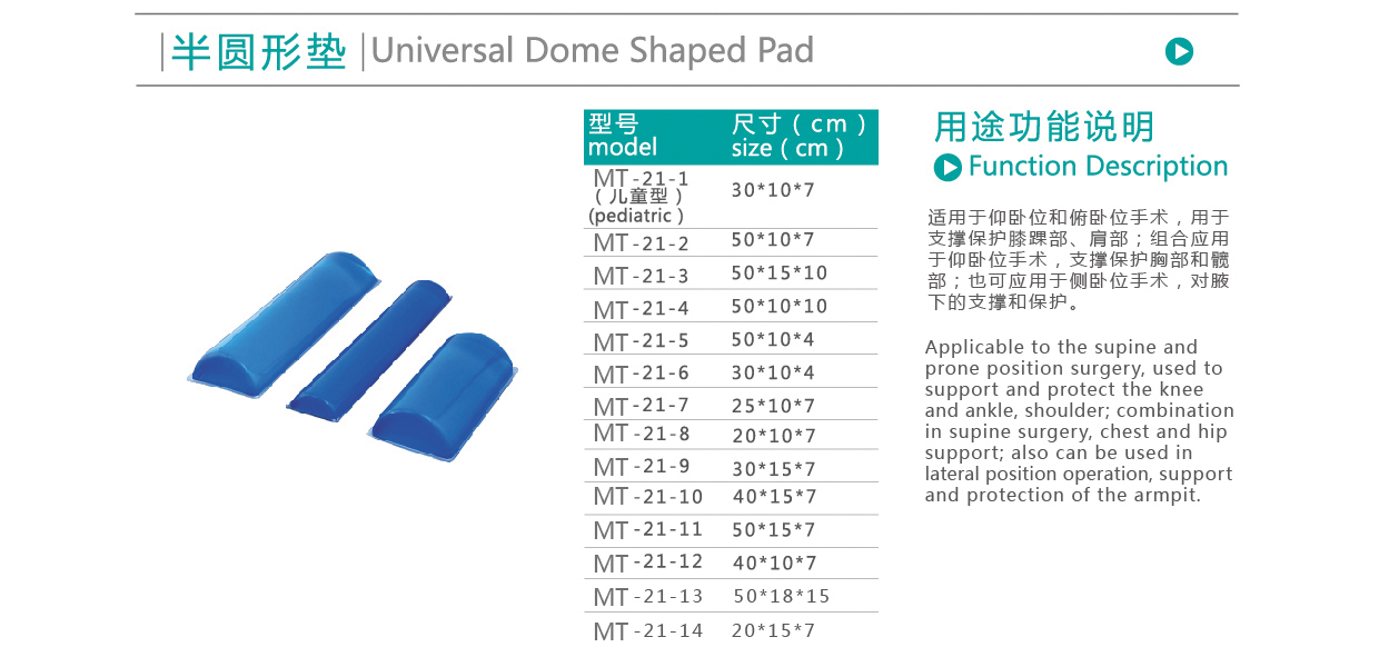【产品用途】:适用于仰卧位和俯卧位手术,用于支撑保护膝踝部、肩部;组合应用于仰卧位手术,支撑保护胸部和髋部;也可应用于侧卧位手术,对腋下的支撑和保护
